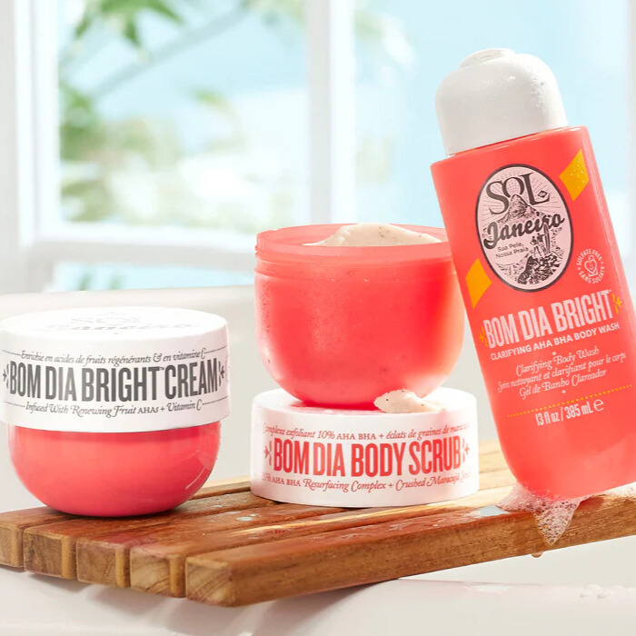 La crema corporal contiene AHA de frutas para ayudar a suavizar la piel, mientras que la vitamina C actúa para iluminar y unificar el tono de la piel.