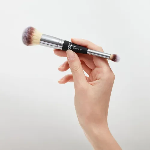 Su punta grande y suave permite aplicar la base de maquillaje a la perfección, mientras que la punta pequeña difumina las imperfecciones en las zonas de difícil acceso y permite aplicar el corrector para obtener un resultado impecable en todo momento.