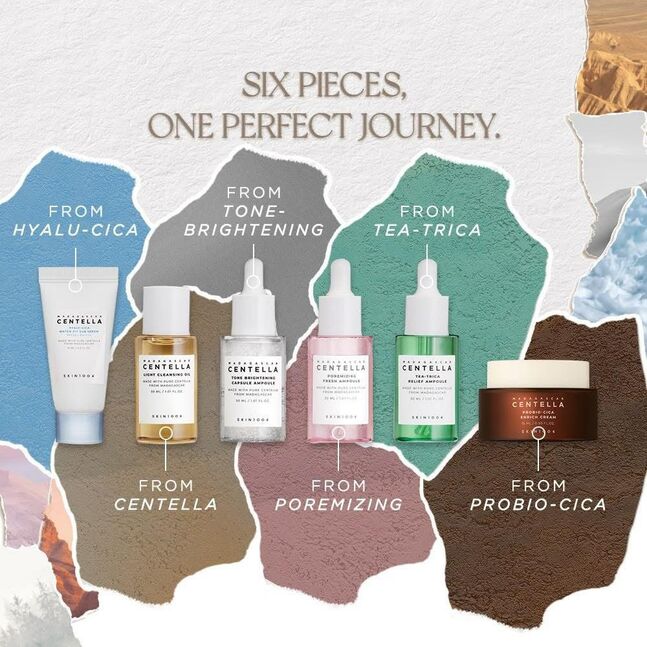 El set incluye Hyalu Cica WaterFit Serum protector solar SPF50+PA++++, Centella Light Clensing Oil, Ampolla cápsula Tone Brightening Madagascar, Centella Poremizing Fresh Ampoule, TeaTrica Relief Ampoule y Centella ProbioCica Enrich Cream.