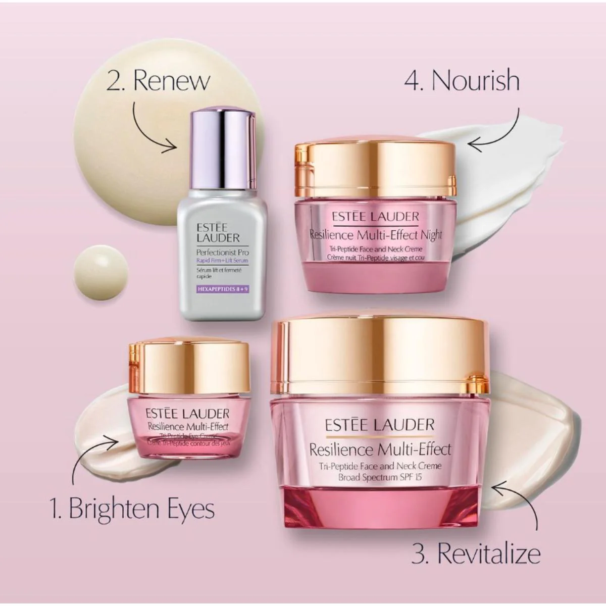 Este set contiene una Crema facial y para el cuello Resilience Multi-Effect Tri-Peptide de amplio espectro SPF 15, tamaño completo de 50 ml, Serum reafirmante y lifting rápido Perfectionist Pro con hexapéptidos 8 + 9 en tamaño de 15 ml, Crema facial y para el cuello multiefecto Resilience de 15 ml y Crema contorno de ojos multiefecto con tripéptidos Resilience de 5 ml.