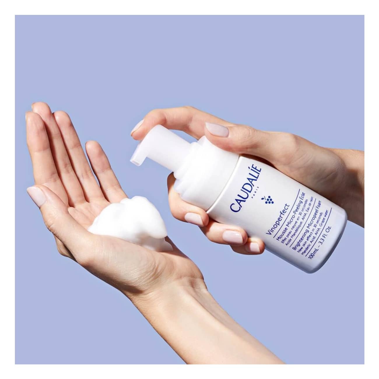 La espuma aclarante contiene como ingredientes claves Agua de Uva Orgánica y AHA que revitalizan la piel.